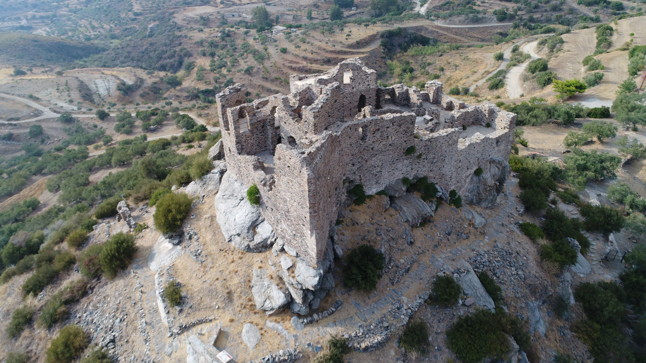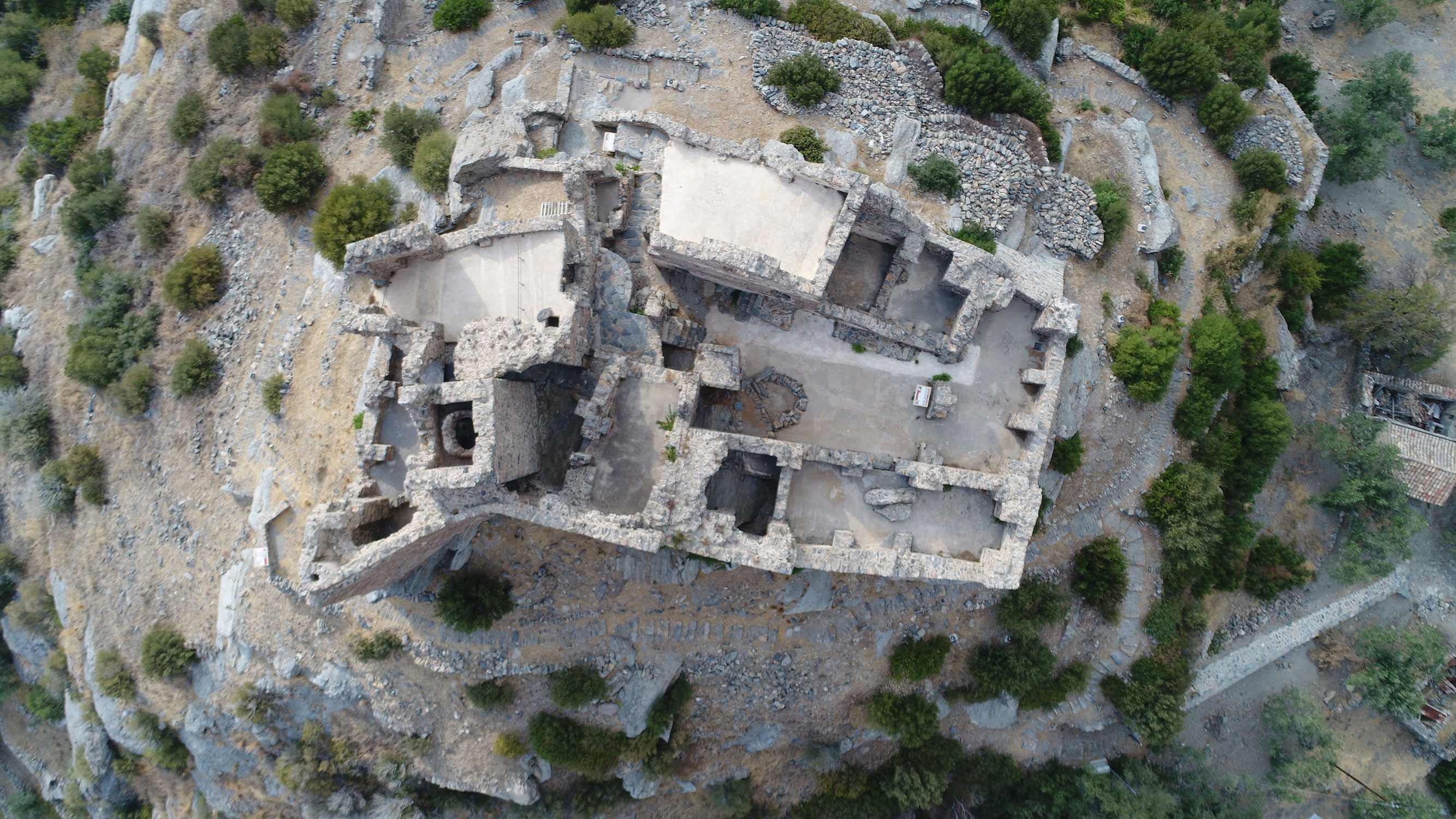 Τα τείχη του εξωτερικού περιβόλου σώζονται σήμερα αποσπασματικά, σε χαμηλό ύψος, ενώ στα βόρεια ενισχύονται με δύο προμαχώνες. Προστάτευαν μικρό οικισμό, από τον οποίον έχουν εντοπιστεί διάσπαρτα κτίσματα, καθώς και ερείπια ενός μικρού ναού στα δυτικά. Στα βόρεια υπάρχει είσοδος ενταγμένη σε πύργο, από την οποία ξεκινούσε η άνοδος προς το κάστρο στην κορυφή του λόφου.
