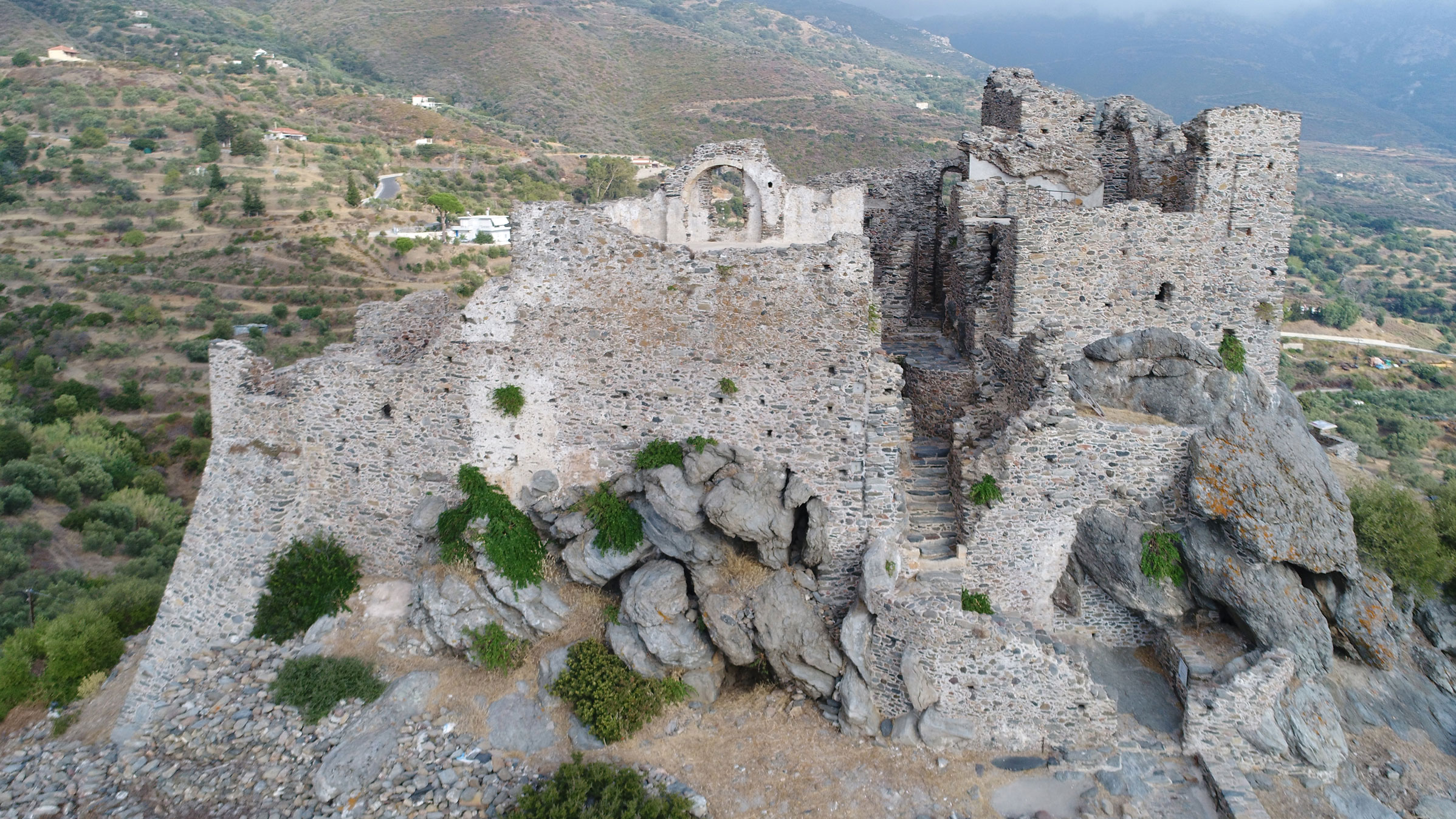 Τα τείχη του εξωτερικού περιβόλου σώζονται σήμερα αποσπασματικά, σε χαμηλό ύψος, ενώ στα βόρεια ενισχύονται με δύο προμαχώνες. Προστάτευαν μικρό οικισμό, από τον οποίον έχουν εντοπιστεί διάσπαρτα κτίσματα, καθώς και ερείπια ενός μικρού ναού στα δυτικά. Στα βόρεια υπάρχει είσοδος ενταγμένη σε πύργο, από την οποία ξεκινούσε η άνοδος προς το κάστρο στην κορυφή του λόφου.