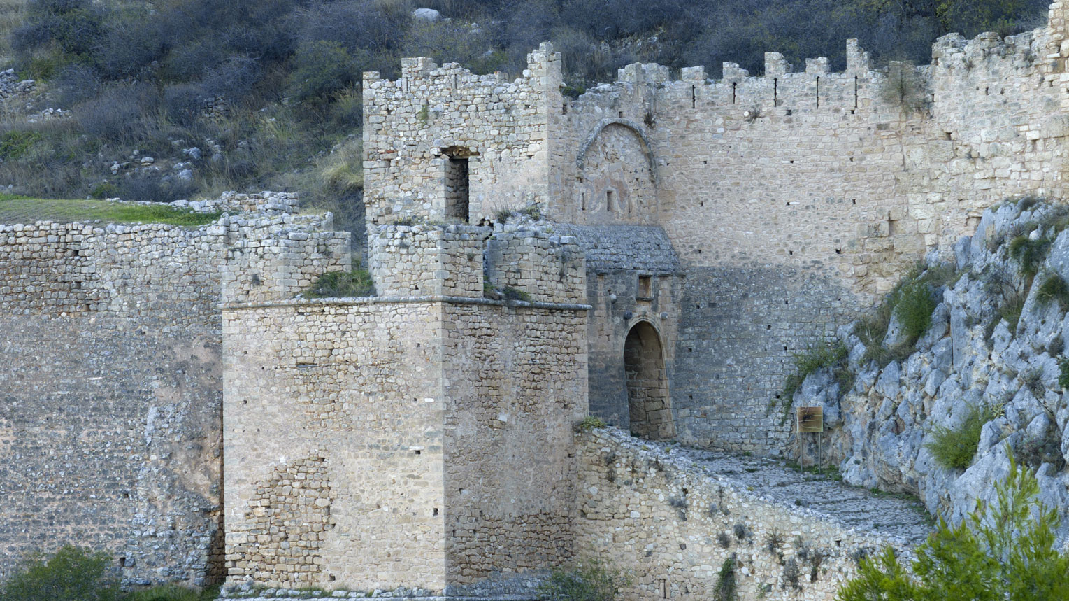 Η κύρια πρόσβαση στο κάστρο βρίσκεται στην ομαλότερη, δυτική πλευρά του λόφου και διαμορφώνεται με τρεις μνημειακές πύλες, που αντιστοιχούν στις τρεις γραμμές οχύρωσης της πλευράς αυτής. Η πρώτη πύλη αντιστοιχεί στην εξωτερική γραμμή οχύρωσης και χρονολογείται στο α΄ μισό του 15ου αιώνα, είναι τοξωτή και επιστέφεται με τυφλό τόξο, στο οποίο διατηρείται βυζαντινή μαρμάρινη πλάκα σε δεύτερη χρήση. Μπροστά από την πύλη υπήρχε τάφρος με ξύλινη κινητή γέφυρα. Η δεύτερη πύλη, της ενδιάμεσης γραμμής οχύρωσης χρονολογείται κατά τη μεσοβυζαντινή περίοδο και ανοίγεται στη βάση ενός πύργου με όροφο και δωμάτιο το οποίο πιθανώς λειτουργούσε ως παρεκκλήσιο, ενώ δύο ακόμα πύργοι, νότια και δυτικά, ενίσχυαν την ασφάλειά της. Η τρίτη πύλη, επίσης μεσοβυζαντινή, που αντιστοιχεί στην τελευταία εσωτερική γραμμή οχύρωσης και οδηγεί στο μέσα κάστρο, ανοίγεται μεταξύ δύο πύργων. Για την κατασκευή της έχει χρησιμοποιηθεί αρχαίο οικοδομικό υλικό και διακοσμείται με τυφλό πεταλόσχημο τόξο.