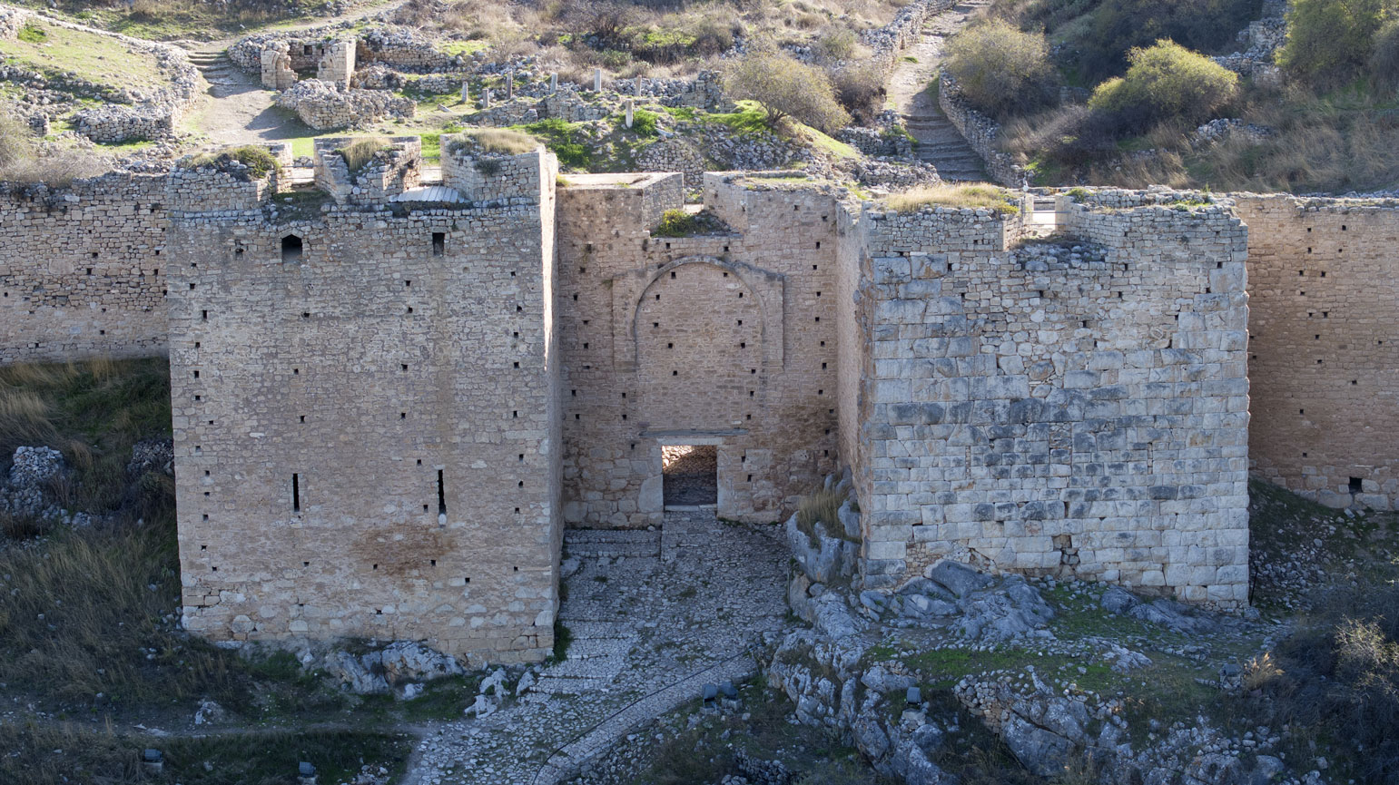 Τέλος, δύο διαδοχικές πύλες ανοίγονται στην ακρόπολη, στα νοτιοδυτικά του κάστρου. Η μία οδηγεί μέσω των εξωτερικών τειχών στον χώρο της ακρόπολης, ενώ η δεύτερη οδηγεί από την ακρόπολη στο εσωτερικό του μέσα κάστρου.