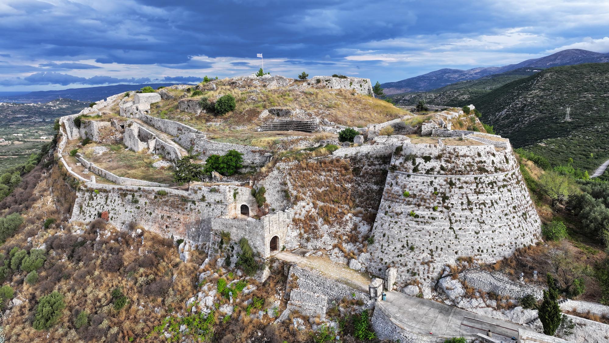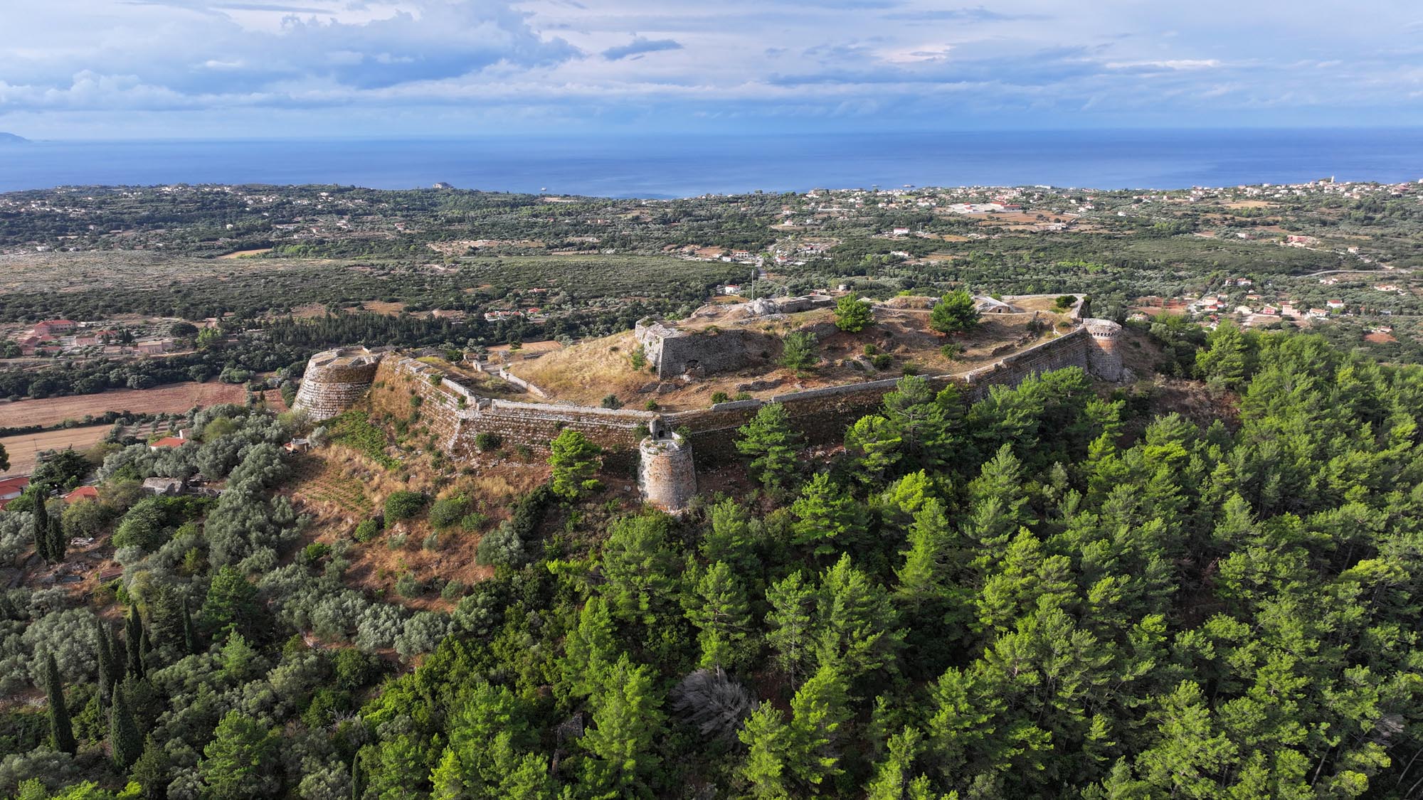 Η οχύρωση, συνολικού μήκους 600 μ. περίπου, ακολουθεί το φυσικό ανάγλυφο του υψώματος και σχηματίζει σε κάτοψη επίμηκες ακανόνιστο πολύγωνο. Η άμυνα των τειχών ενισχύεται με τρεις προμαχώνες, ισχυρότερος εκ των οποίων είναι ο νοτιοανατολικός, που προστατεύει την είσοδο, αλλά και την πιο ευάλωτη πλευρά των οχυρώσεων προς τον οικισμό του προαστίου. Η μοναδική είσοδος ανοίγεται αριστερά του νοτιοανατολικού προμαχώνα, σε ορθογώνια εσοχή, ώστε να είναι προστατευμένη και δυσπρόσιτη σε εχθρικές επιδρομές. Η σημερινή μορφή της πύλης είναι αποτέλεσμα μεταγενέστερων επεμβάσεων.