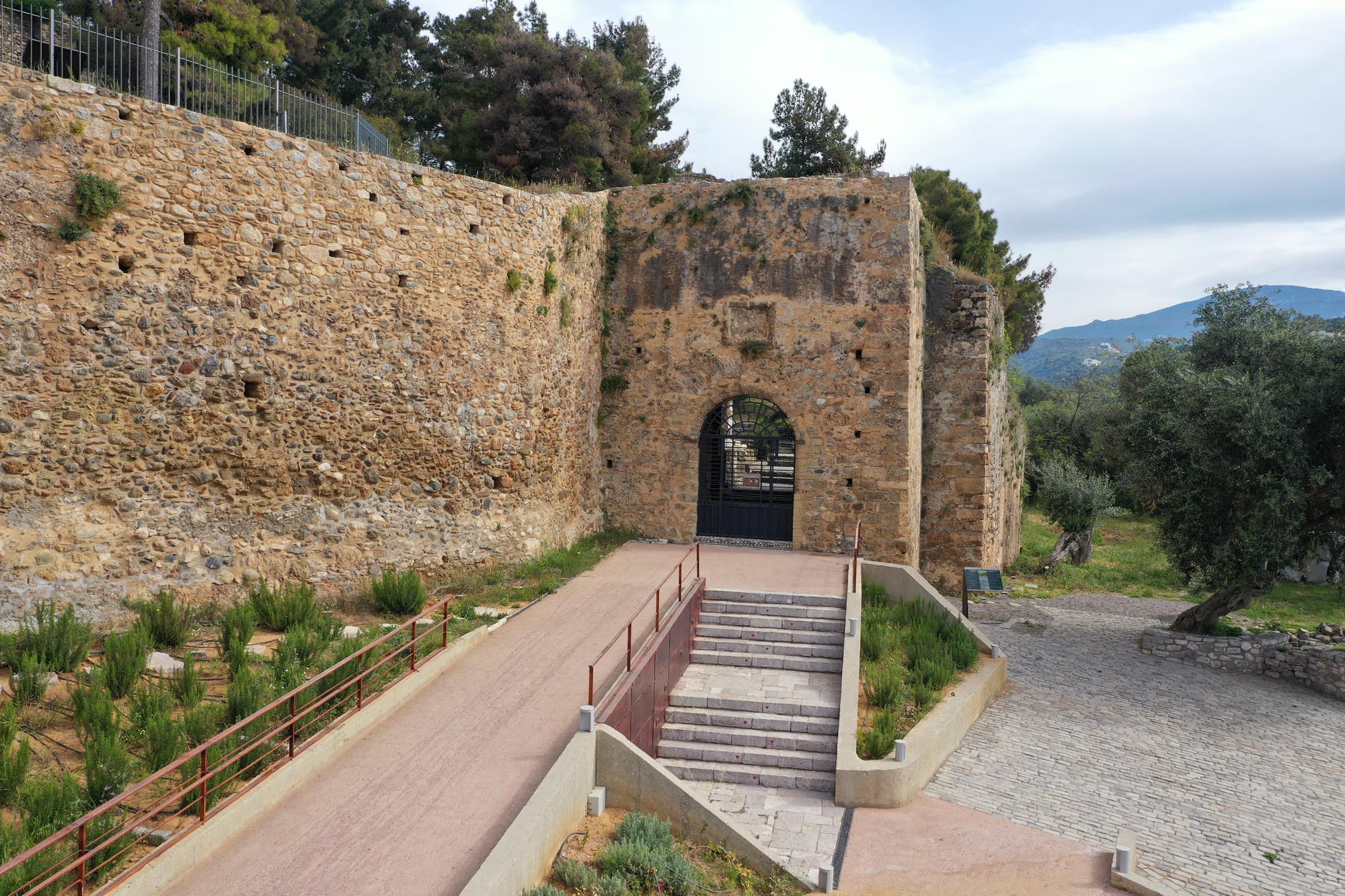 Τετράγωνος πυλώνας αποτελεί τη μοναδική είσοδο του κάστρου και βρίσκεται στην ανατολική πλευρά των τειχών. Χρονολογείται στην περίοδο της Β΄ βενετοκρατίας (1685-1715) από το εντοιχισμένο εξωτερικά ανάγλυφο με τον λέοντα του Αγίου Μάρκου, έμβλημα της Βενετίας. Μετά την πύλη, κτιστά σκαλοπάτια, διαμόρφωση του 20ού αιώνα, οδηγούν στην πύλη του εσωτερικού περιβόλου. Πριν φτάσει ο επισκέπτης εκεί συναντά την είσοδο του μικρού ανοιχτού θεάτρου της δεκαετίας του 1960, στο οποίο φιλοξενούνται τους θερινούς μήνες πολιτιστικές εκδηλώσεις.