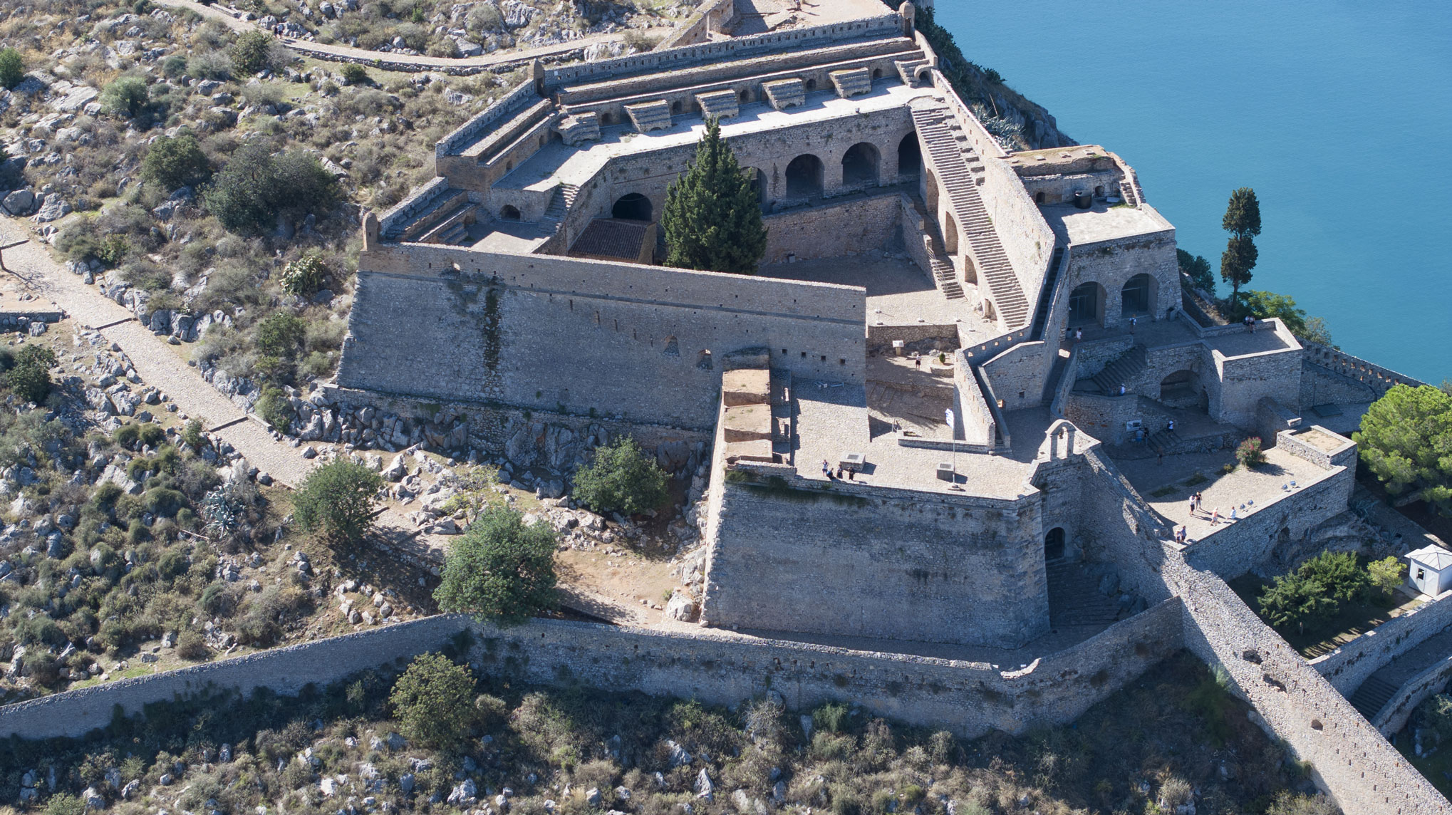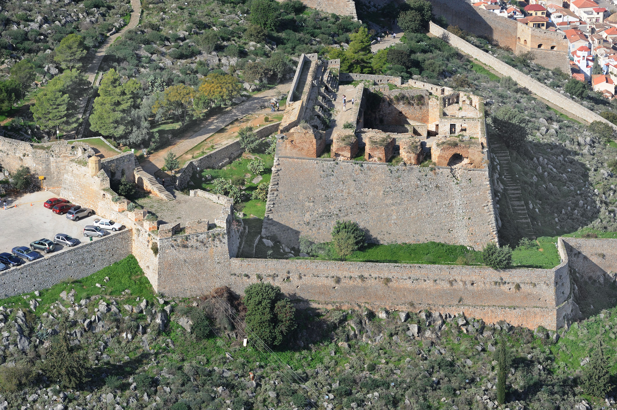 Ο καινοτόμος σχεδιασμός του φρουρίου περιλαμβάνει μεμονωμένα οχυρώματα-προμαχώνες σε στρατηγικά σημεία του λόφου, μεριμνώντας ώστε τα πυροβόλα όπλα του ενός να καλύπτουν τους διπλανούς προμαχώνες με το βεληνεκές τους. Τείχος τους συνέδεε, ώστε οι υπερασπιστές τους να μετακινούνται από τον ένα στον άλλο με ασφάλεια. Οι προμαχώνες λειτουργούσαν αλληλοϋποστηριζόμενοι, ως ενιαίο αμυντικό σύνολο, αλλά παρέμεναν αυτόνομα οχυρά και περιλάμβαναν στρατώνες, δεξαμενές νερού και αποθήκες πυρομαχικών και τροφίμων για την κάλυψη των αναγκών της φρουράς τους. Σε περίπτωση που ο εχθρός καταλάμβανε τον έναν, η άμυνα του φρουρίου θα συνεχιζόταν από τους υπόλοιπους προμαχώνες.