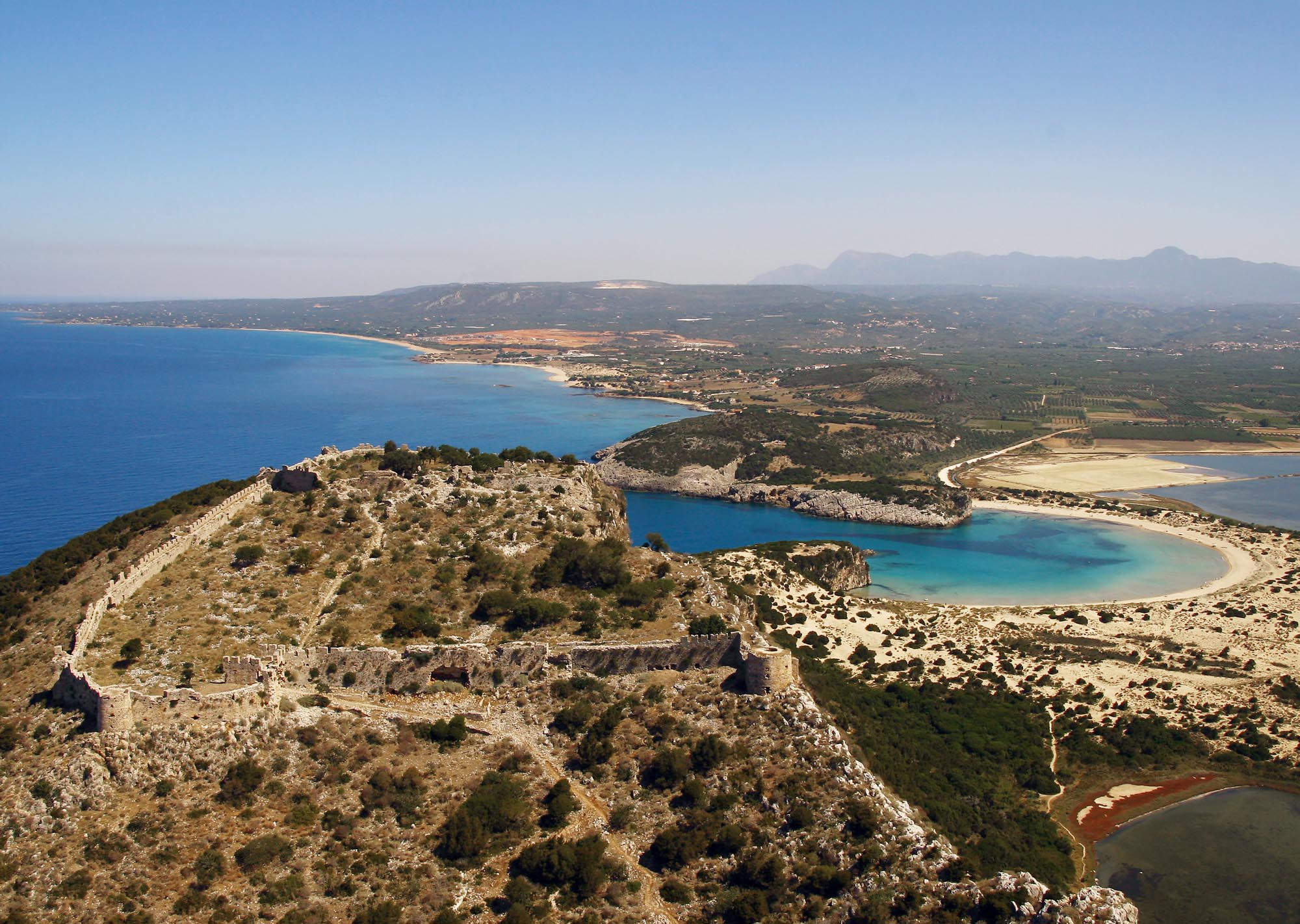 Η χερσόνησος του Κορυφασίου είναι πλούσια σε αρχαιολογικά κατάλοιπα, που μαρτυρούν ανθρώπινη παρουσία ήδη από την 3η χιλιετία π.Χ. Το 425 π.Χ., οι Αθηναίοι, με παρότρυνση του Δημοσθένη, οχύρωσαν τα πιο ευπρόσβλητα σημεία του λόφου, μετατρέποντας τον σε στρατιωτική βάση, ενώ η πολίχνη, που συνακόλουθα δημιουργήθηκε, διατηρήθηκε κατά τους ελληνιστικούς και τους ρωμαϊκούς χρόνους.
