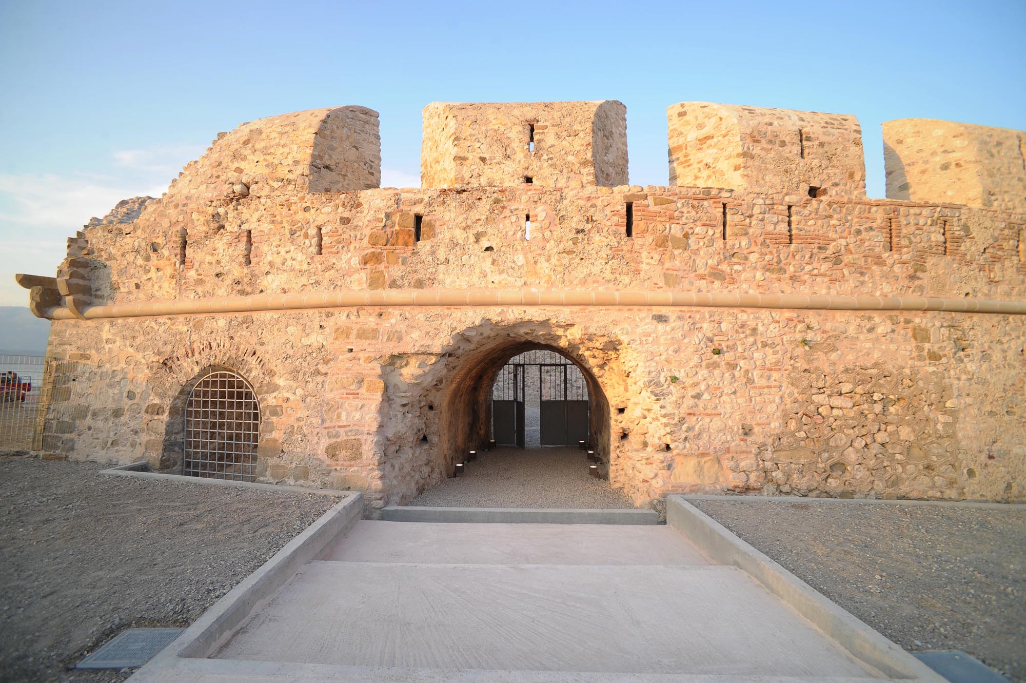 Η είσοδος του φρουρίου βρισκόταν στο ανατολικό τμήμα της νότιας πλευράς των τειχών. Όπως έχει αποδείξει η αρχαιολογική έρευνα, στην αρχική της μορφή ήταν μια απλή καμαροσκέπαστη δίοδος που ανοιγόταν στο πάχος τους τείχους. Ενισχύθηκε και έλαβε τη μορφή που διατηρεί μέχρι σήμερα κατά τη β΄ οθωμανική οικοδομική φάση (1537/8). Τότε διαμορφώθηκε ως ένας σχεδόν πεταλόσχημος χώρος με δύο ανοίγματα (ένα στη βόρεια και ένα στη δυτική πλευρά) σε διάταξη ανεστραμμένου Γ, ο οποίος καλύπτεται από θόλο που προεξέχει σαν πύργος από το τείχος. Αργότερα, κατά τη βενετική περίοδο, η πύλη ενσωματώθηκε στον νοτιοανατολικό προμαχώνα που κατασκευάστηκε στην περιοχή αυτή.